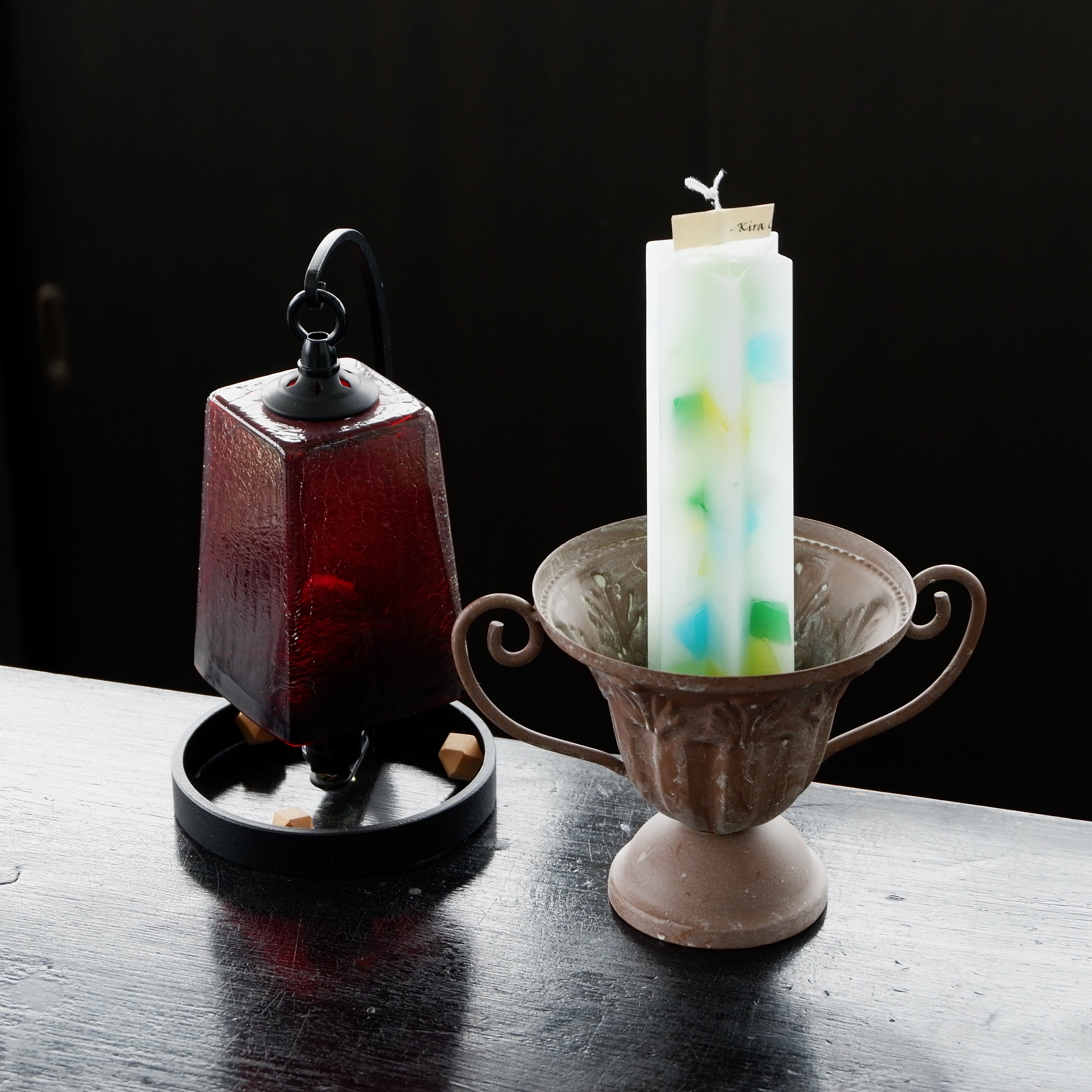 カラフルな欠片を散りばめた〈彩の欠片(いろのかけら)シリーズ〉として人気をいただいている無香キャンドルを4色セットでご用意しました